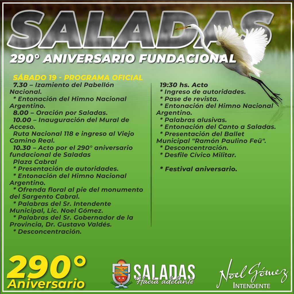 El intendente municipal, Licenciado Noel Gómez, invita a la población a las actividades que se realizarán este sábado 19 de noviembre, con motivo de celebrar un nuevo cumpleaños de la ciudad. El gobernador Gustavo Valdés arribará por la mañana e inaugurará obras junto al mandatario comunal.