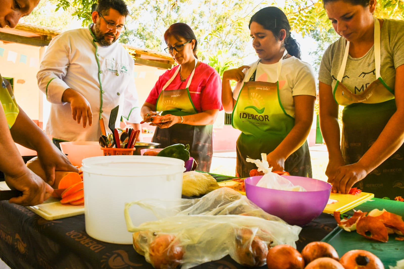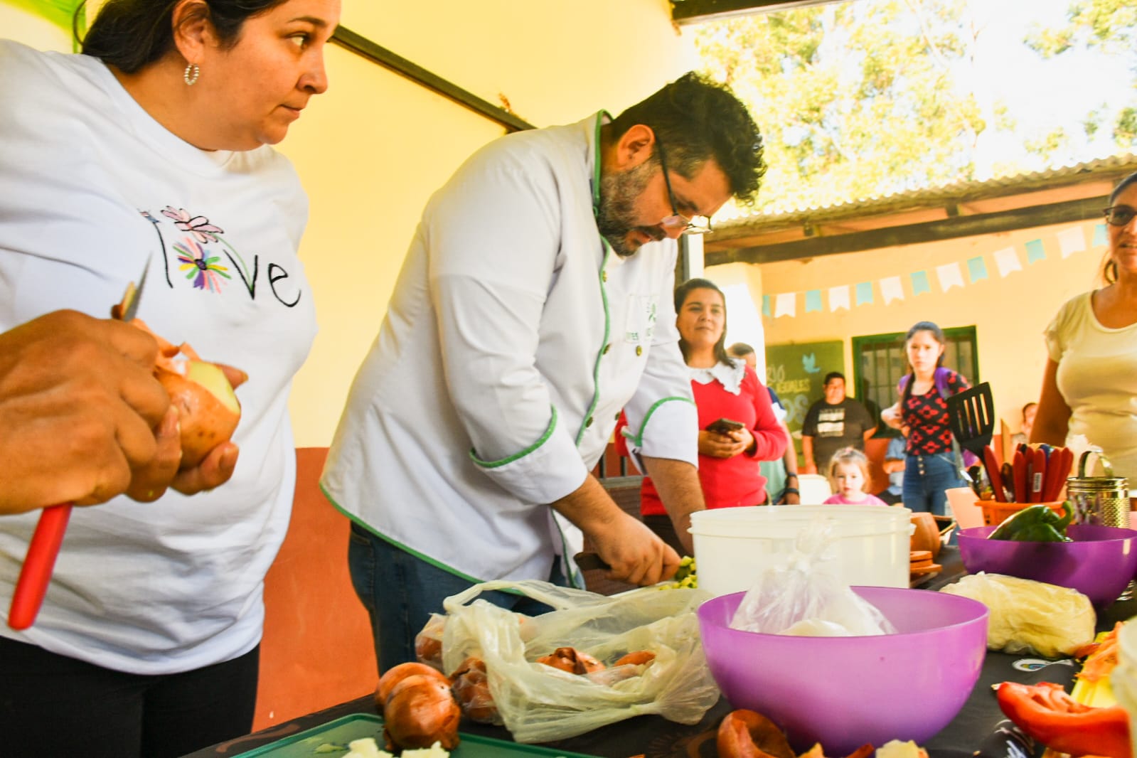 Seguidamente se trabajó en dos grupos. Por un lado el Chef Elías Altamirano, capacitando a las familias sobre alimentación saludable, con la posibilidad de elaborar alimentos en base a productos de la zona, poniendo en práctica la cocina, recomendaciones sobre el lavado de manos y el correcto manejo de los alimentos.
